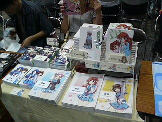 既刊と新刊一式ずらりって感じでしょうか。こんな感じで設置して、あとはあっちやこっちに新刊バラ撒いて開場を待つばかり。そういえば、設置のときに魚酢さんが現れたんですが、閉会後に他の人にいろいろ聞いたら「いたの?」とか「見てない」とか、暗に「おまえ寝惚けてんのか」と言わんばかりの態度をされまくったんですが、本当にいましたよね……?