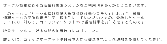 というわけで、昨日に冬コミの当落結果が出たわけですが、うちは以下のような結果となりました。