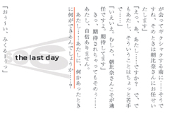 「パニック・ティーパーティ」P18の三段目、last dayの前のところです。赤線引いているところの一文が、すっぽり抜け落ちております。初版本はすべて抜けております。これは印刷上のミスとかではなく、こちらの完全なフローっていう、ええっと文字数オーバーな関係ではみ出ちゃったってわけなのです。