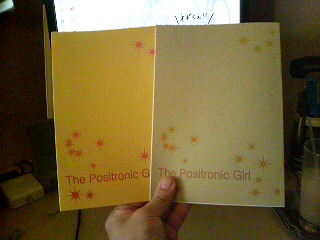 挿絵なしで本分12ページ。表紙デザインはじぇばんに(が一晩でやりました)。タイトルは「The Positronic Girl」です。画像じゃ白いですが、茶系の色紙に印刷しとります。